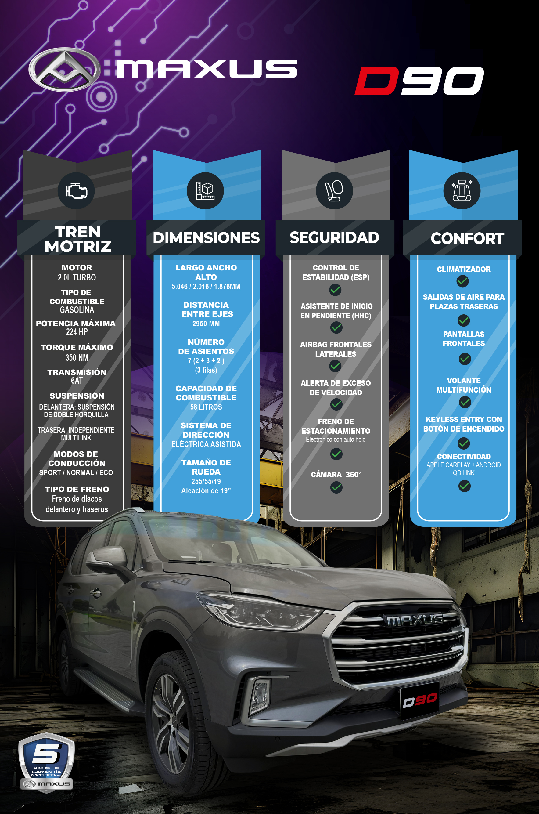 La nueva MAXUS D90 es un SUV familiar de 7 puestos que llega al mercado venezolano para liderar en el segmento SUV grandes. Destaca por su gran espacio interior, equipamiento completo y capacidades todo terreno. • Exterior: Diseño robusto y elegante, gran parrilla cromada, faros LED y llantas de aleación de 19 pulgadas. • Interior: Espacioso y confortable. Asientos tapizados en cuero con regulación eléctrica. Tablero de instrumentos digital y pantalla táctil de 12,3 pulgadas. • Capacidad: 4x4 con Bloqueo Diferencial trasero.