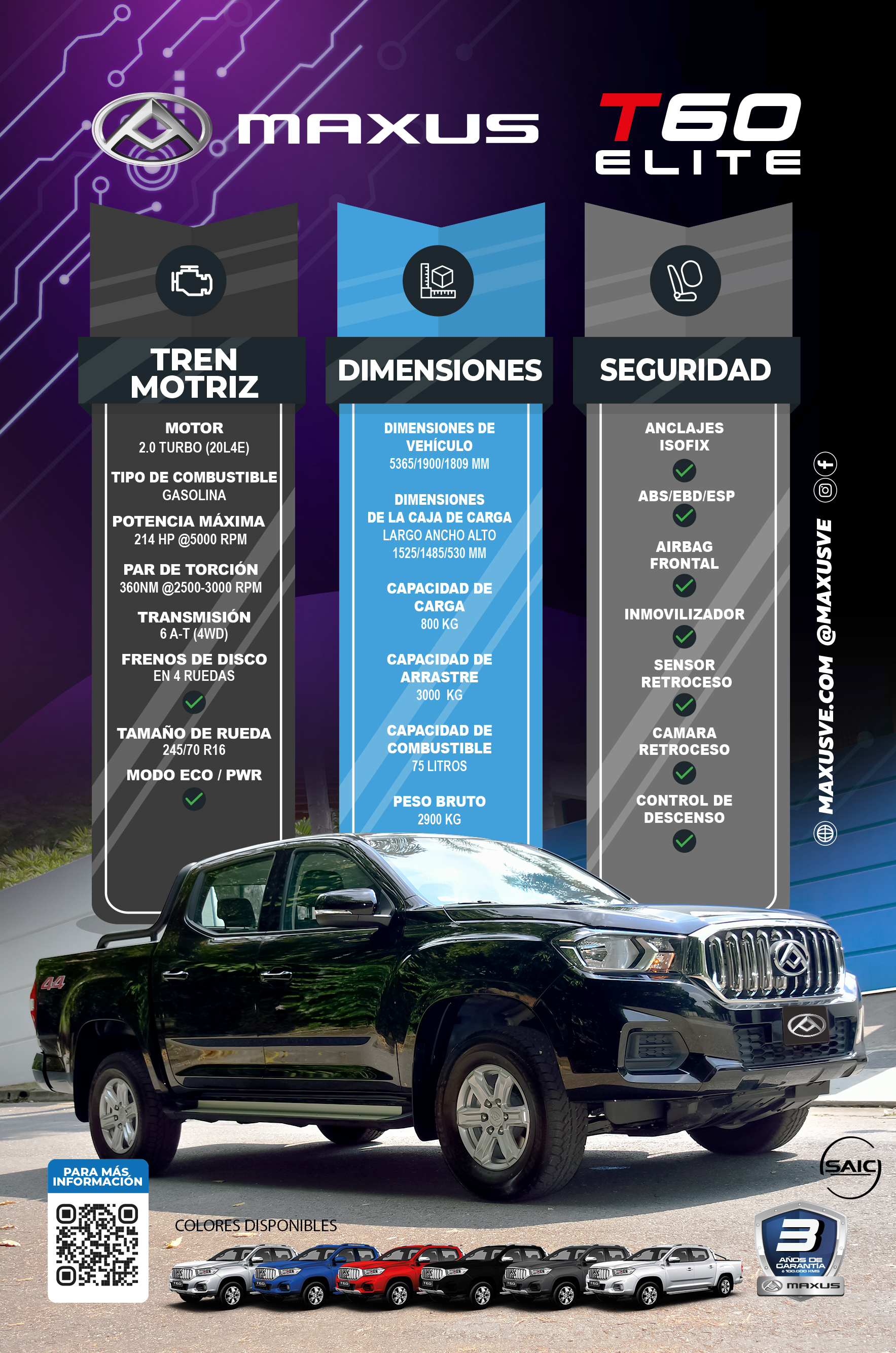 La Maxus T60 Elite cuenta con un motor a gasolina, te ofrece una potencia máxima 214 HP 160KW, lo que la convierte en una camioneta potente y capaz de enfrentar cualquier desafío. • Ideal para transportar cargas pesadas. • Doble cabina, amplio espacio interior, tapicería sintética. • Equipamiento de seguridad de última generación: Cónsola de monitoreo digital, Cámara de apoyo de marcha atrás, Sensor de estacionamiento.